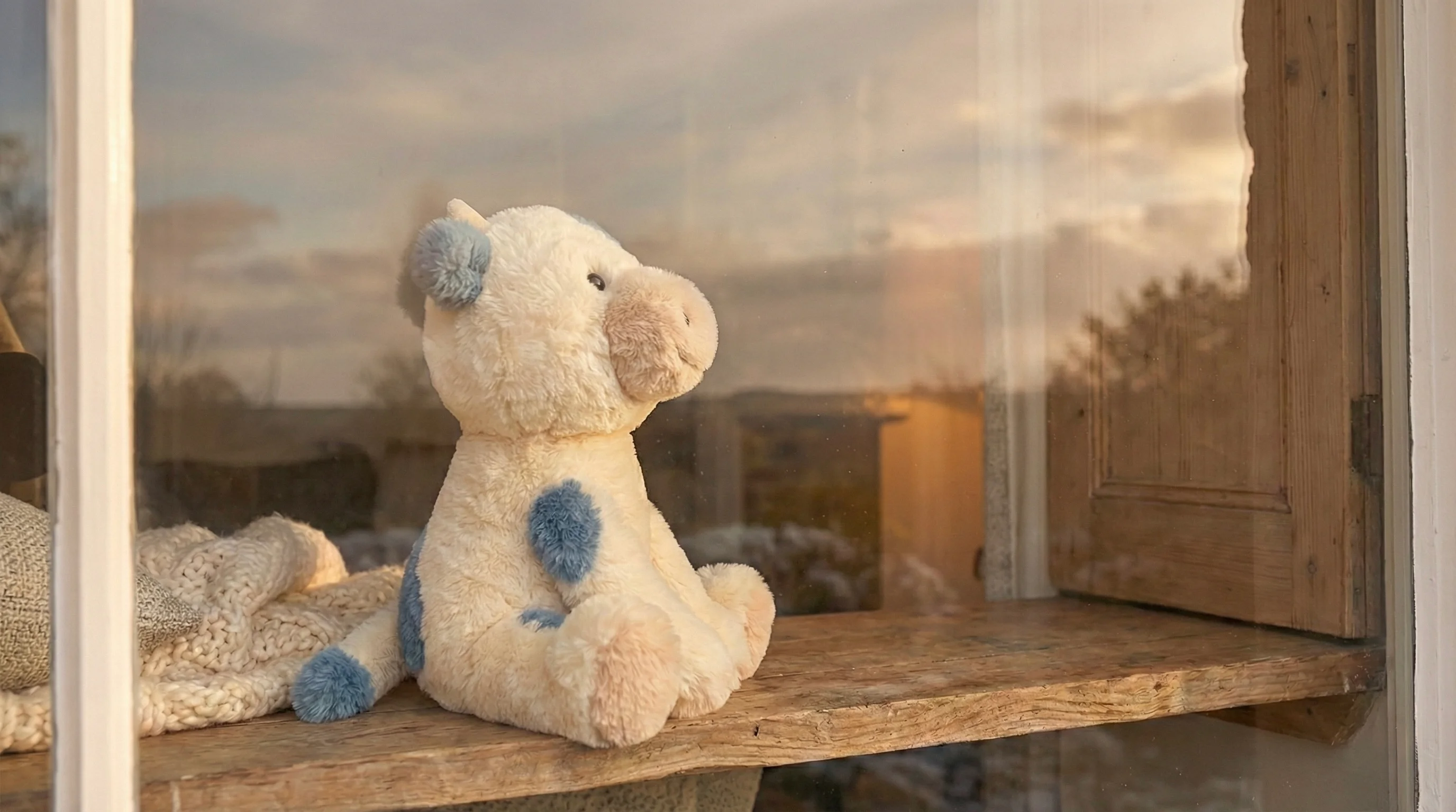 This plush cow is a stunner. He features a gorgeous cream-coloured plush fur that contrasts perfectly with his quirky navy blue spots. He isn’t your standard farmyard friend; those velvety-soft beige horns give him such a gentle, refined look. I’ve popped him on the window seat amongst the velvet cushions, and he brings such a calming, whimsical vibe to the room. When the grey sky feels a bit heavy, looking over at Barnaby’s soulful eyes makes me feel instantly grounded. He’s not just decor; he’s a reminder to slow down and graze on the good moments. 🐮